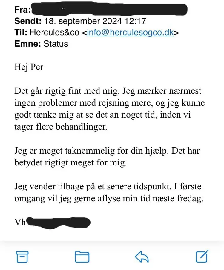 Her finder du et udpluk af de mange udtalelser, som er fremsendt eller givet af tidligere og nuværende klienter hos Hercules&Co. Har du lyst til at hjælpe os med at komme rejsningsproblemer til livs, er du mere end velkommen til at skrive en kort udtalelse om dit forløb hos os. Du kan enten fremsende den pr. mail til info@herculesogco.dk eller rulle ned i bunden af denne side. Her kan du skrive din udtalelse direkte via Google.